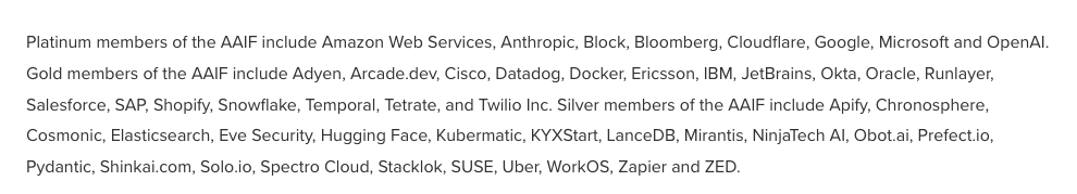 Linux基金会的公告也显示,AAIF的会员单位还有、IBM、、、SAP、Shopify、Hugging Face、等科技公司和互联网平台企业。