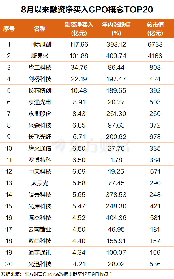 Choice数据显示,自今年8月以来,杠杆资金抢筹多只CPO概念股,融资净买入排名前20个股合计净买入超377亿元。