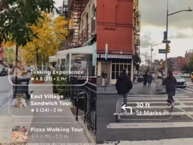 在上述谷歌Android XR特别发布会上,主持人现场演示了AI眼镜的真实场景应用。第一视角画面中,设备可提供周边美食推荐、导航、地点标记、聚会拍照等旅行辅助功能;在机场等复杂场景下,用户预订Uber后,无需放下行李或掏出手机,即可通过眼镜快速定位上车点。谷歌方面表示,该系列AI眼镜将于明年上市。