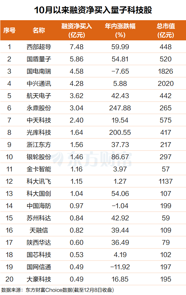 Choice数据显示,自10月以来,杠杆资金净买入多只量子科技概念股,其中排名第一,融资净买入超7亿元;国盾量子排名第二,融资净买入接近6亿元。
