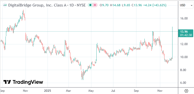受该消息影响,正在交易的DigitalBridge涨超43%,年内由跌转为涨近24%,总市值超过25亿美元。