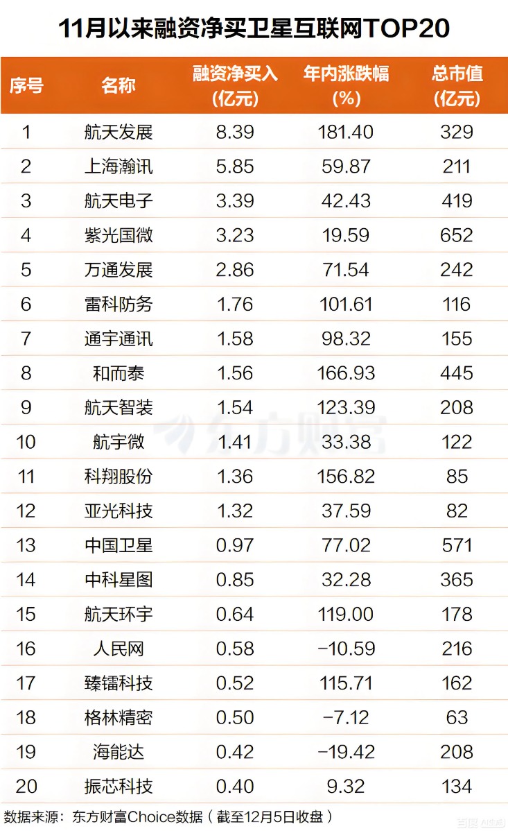 Choice数据显示,今年11月以来,杠杆资金抢筹多只卫星互联概念,航天发展排名第一,融资净买入超8亿元;上海瀚讯排名第二,融资净买入近6亿元。