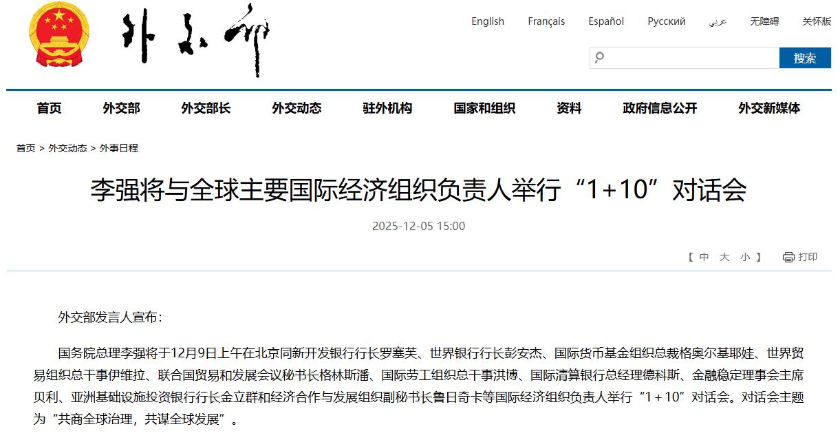 李强将与全球主要国际经济组织负责人举行“1+10”对话会 admin 2025-10-06 18115 默认 外交部发言人宣布: 国务院总理李强将于12月9日上午在北京同新开发银行行长罗塞芙、世界银行行长彭安杰、国际货币基金组织总裁格奥尔基耶娃、世界贸易组织总干事伊维拉、联合国贸易和发展会议秘书长格林斯潘、国际劳工组织总干事洪博、国际清算银行总经理德科斯、金融稳定理事会主席贝利、亚洲基础设施投资银行行长金立群和经济合作与发展组织副秘书长鲁日奇卡等国际经济组织负责人举行“1+10”对话会。对话会主题为“共商全球治理,共谋全球发展”。 (文章来源:外交部网站) 海报 阅读 QQ 分享 微博分享 微信分享 分享 上一篇全球市值最高电力股同日官宣谷歌、Meta新合作 下一篇金融监管总局调整保险公司相关业务风险因子 全球市值最高电力股同日官宣谷歌、Meta新合作上一篇 金融监管总局调整保险公司相关业务风险因子下一篇