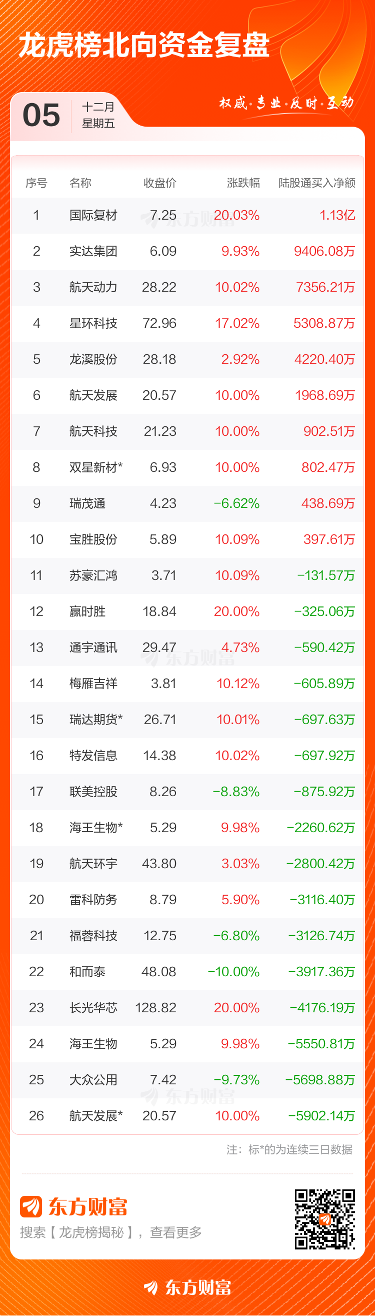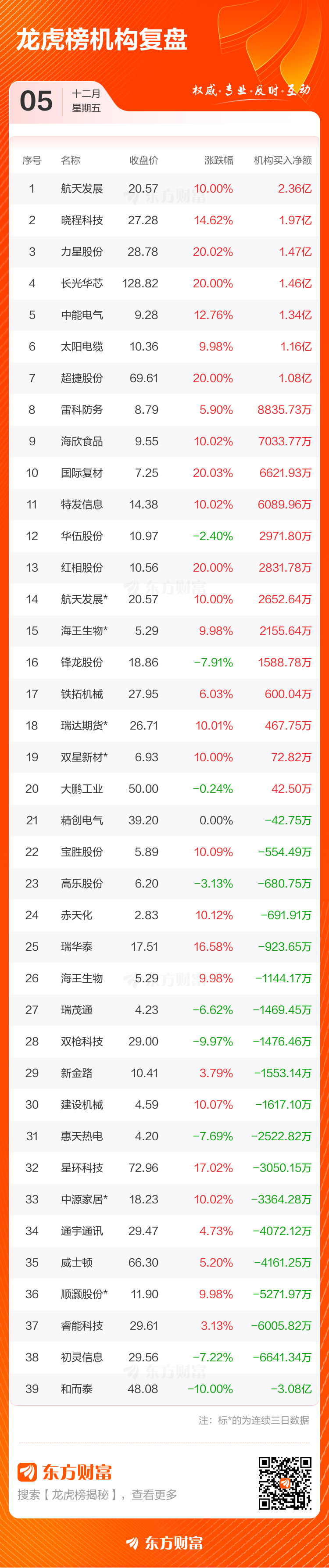 12月5日共有56只个股上榜龙虎榜,总上榜成交额218.01亿元。上榜个股中净买入额最高的是,金额为3.28亿元。