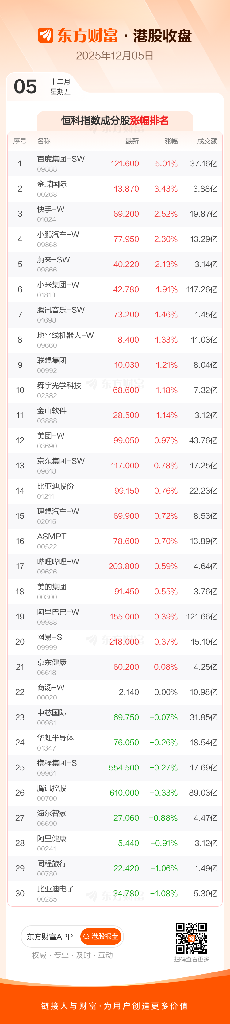 12月5日港股收盘:恒指涨0.58% 中国平安领涨成分股 admin 2025-10-18 23226 默认 港股12月5日收盘走高,恒生指数收报26085.08点,涨149.18点,涨幅0.58%;恒生科技指数收报5662.46点,涨47.03点,涨幅0.84%。恒生指数成分股中、、涨幅居前,、、跌幅靠前。恒生科技指数成分股中百度集团-SW、、涨幅居前,、、跌幅靠前。 免责声明:本文基于AI生产,仅供参考,不构成任何投资建议,据此操作风险自担。 (文章来源:研究中心) 海报 阅读 QQ 分享 微博分享 微信分享 分享 上一篇天普股份:核查工作已完成 股票明起复牌 下一篇第八代五粮液开票价降至900元/瓶?公司:出厂价仍为1019元/瓶 所谓“降价”为补贴后的价格变化 天普股份:核查工作已完成 股票明起复牌上一篇 第八代五粮液开票价降至900元/瓶?公司:出厂价仍为1019元/瓶 所谓“降价”为补贴后的价格变化下一篇