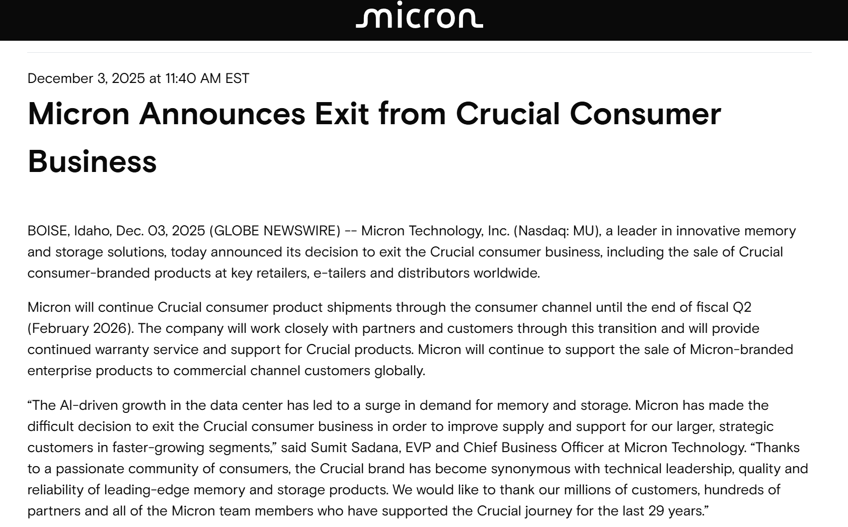 对于这一决定,美光执行副总裁兼首席商务官Sumit Sadana表示:“由AI驱动的增长,带来了对内存和存储的强劲需求。美光已经做出了一个艰难的决定,即退出Crucial消费级业务,以便在增长更快的板块,更好地为我们规模更大的战略性客户提供供应和支持。”