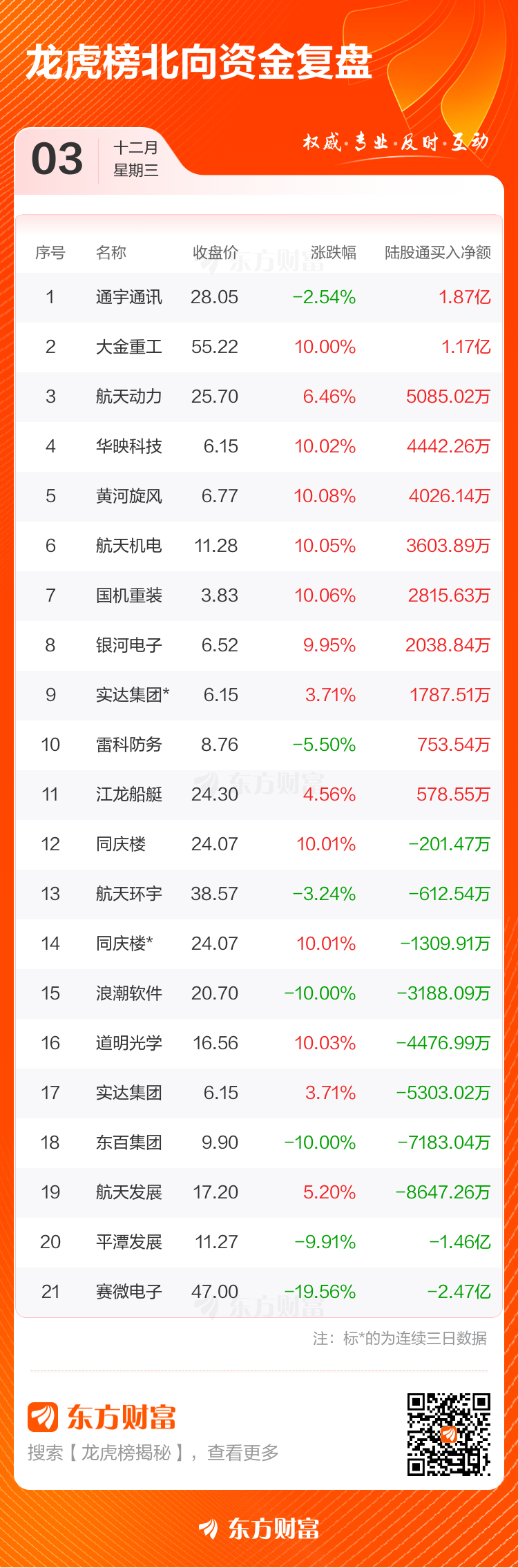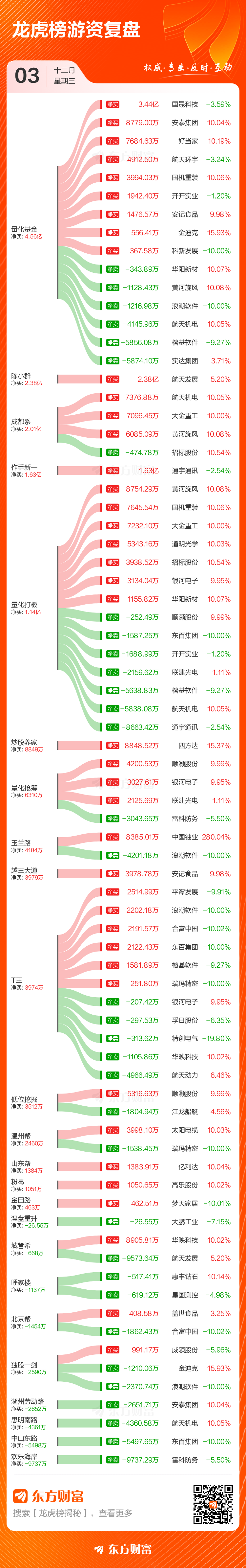 12月3日龙虎榜复盘:“陈小群”2.38亿元净买入航天发展 admin 2025-08-07 11786 默认 12月3日共有57只个股上榜龙虎榜,总上榜成交额230.87亿元。上榜个股中净买入额最高的是中国铀业,金额为4.19亿元。 当天,游资席位净买入金额最高的个股是,“陈小群”净买入2.38亿元。 免责声明:本文基于AI生产,仅供参考,不构成任何投资建议,据此操作风险自担。 (文章来源:研究中心) 海报 阅读 QQ 分享 微博分享 微信分享 分享 上一篇东方财富财经早餐 12月10日周三 下一篇2分钟涨停!一则消息引爆市场!算力产业链又迎来政策支持 东方财富财经早餐 12月10日周三上一篇 2分钟涨停!一则消息引爆市场!算力产业链又迎来政策支持下一篇