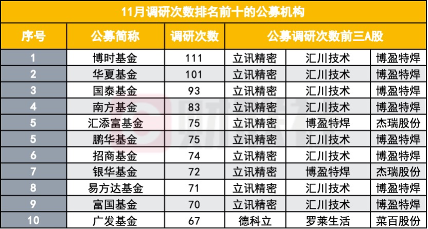 在活跃度方面,11月共有85家公募基金调研次数不低于20次,其中25家机构调研超过50次,头部基金公司调研意愿依旧旺盛。博时基金以111次居首,紧随其后的是华夏基金(101次)和国泰基金(93次),南方基金、汇添富基金、鹏华基金等也均进入调研前十阵营,调研次数集中在67至83次之间。