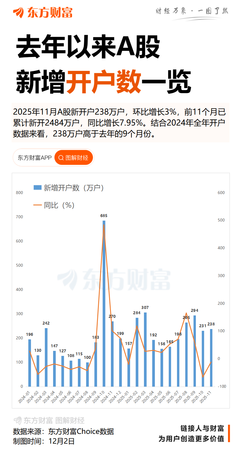 2025年11月A股新开户238万户,环比10月231万户增长3%,2025年前11个月已累计新开2484万户,同比增长7.95%。从月度对比来看,2025年1月A股新开157万户,2月环比实现近翻倍增长,3月突破300万户,4月因关税摩擦市场震荡环比下降37.22%,5月受假期影响进一步回落,6月、7月、8月、9月新开户数持续回升,10月环比下降21%,11月微升3%。与2024年11月新增270万户开户数相比,2025年11月新开户下降12%。结合2024年全年开户数据来看,238万户高于去年的9个月份。