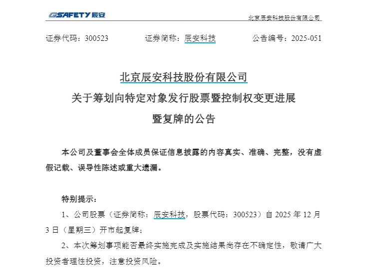 (301073)12月2日晚间发布了筹划公司控制权变更新进展的公告,根据公告,公司股票将自2025年12月3日(星期三)上午开市起复牌。