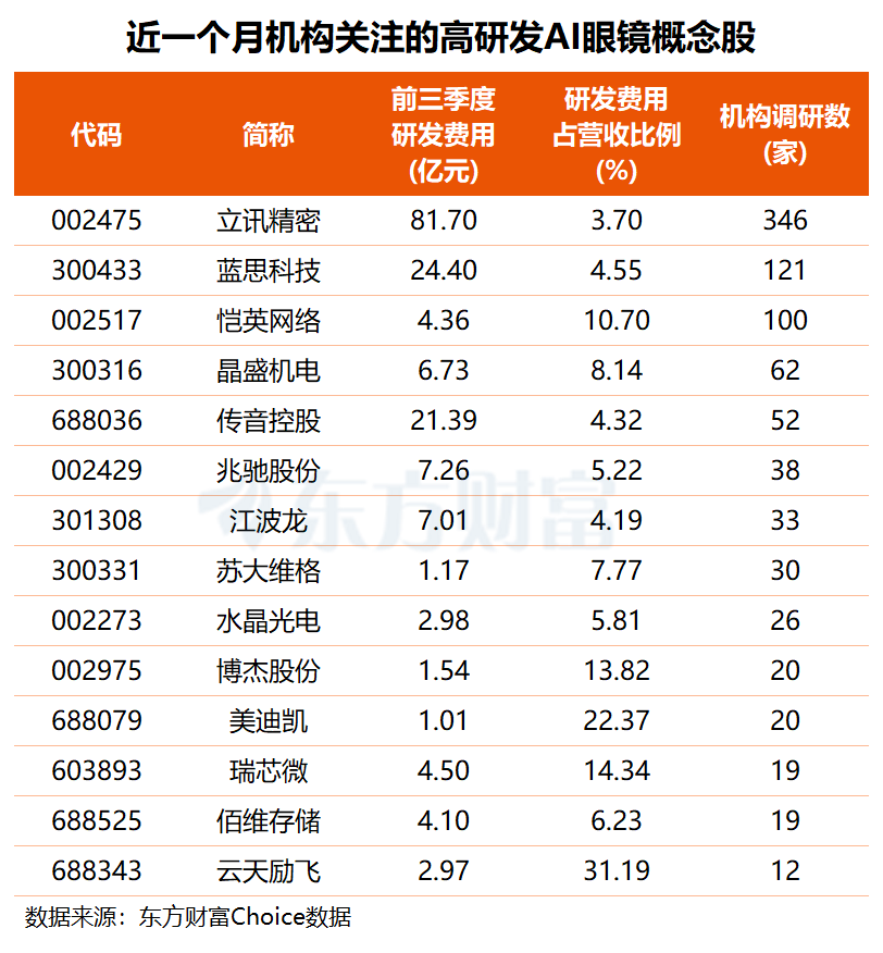 东方财富Choice数据显示,上述65只高研发AI眼镜概念股中,共有8股近一个月获得机构密集调研,其中,消费电子龙头立讯精密获346家机构集中调研,蓝思科技、机构调研数分别为121家和100家,、传音控股近一个月均获超50家机构前往调研。