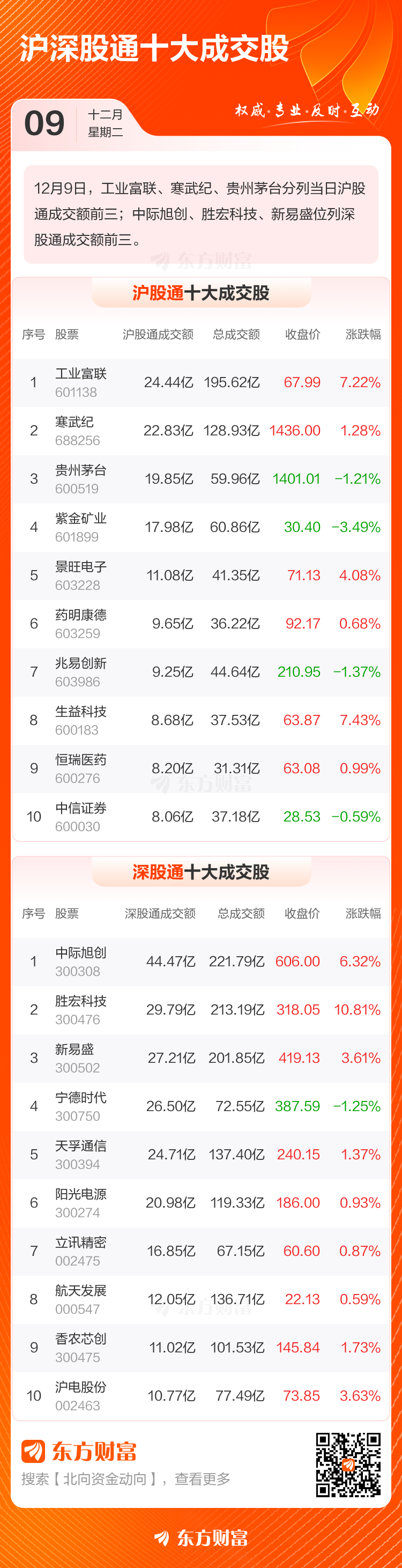 交易所最新数据显示,12月9日北向资金共成交2196.00亿元,占两市总成交额的11.53%。