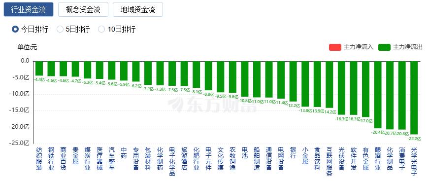 净流出方面,、、等净流出排名靠前,其光电子净流出22.23亿元。