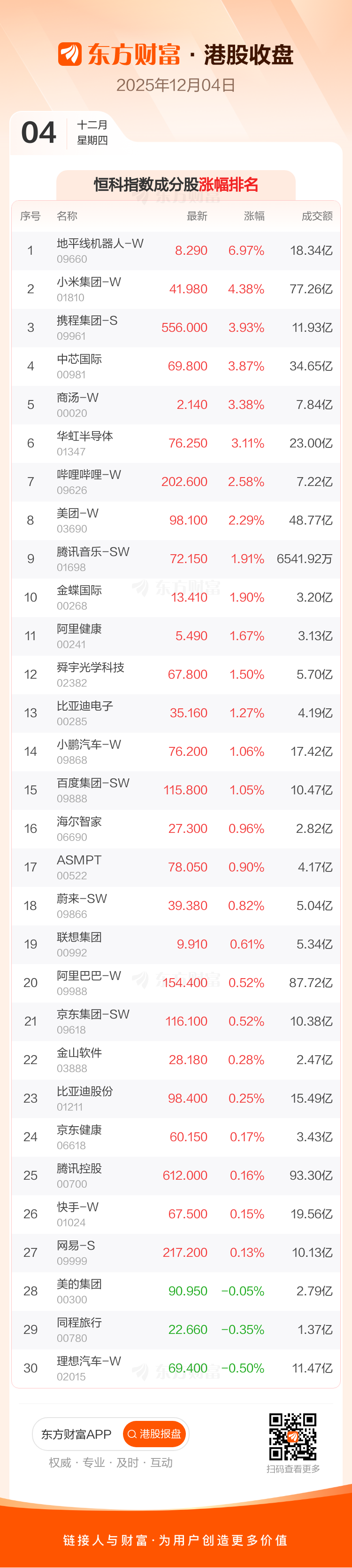 12月4日港股收盘:恒指涨0.68% 科技指数涨1.45% admin 2025-09-15 24207 默认 港股12月4日收盘走高,恒生指数收报25935.9点,涨175.17点,涨幅0.68%;恒生科技指数收报5615.43点,涨80.51点,涨幅1.45%。恒生指数成分股中、、涨幅居前,、、跌幅靠前。恒生科技指数成分股中、小米集团-W、涨幅居前,、、跌幅靠前。 免责声明:本文基于AI生产,仅供参考,不构成任何投资建议,据此操作风险自担。 (文章来源:研究中心) 海报 阅读 QQ 分享 微博分享 微信分享 分享 上一篇我国科学家取得量子研究新进展 终结爱因斯坦与玻尔世纪之辩 下一篇巴西黑天鹅事件!股市大跌 货币重挫约2.5% 我国科学家取得量子研究新进展 终结爱因斯坦与玻尔世纪之辩上一篇 巴西黑天鹅事件!股市大跌 货币重挫约2.5%下一篇