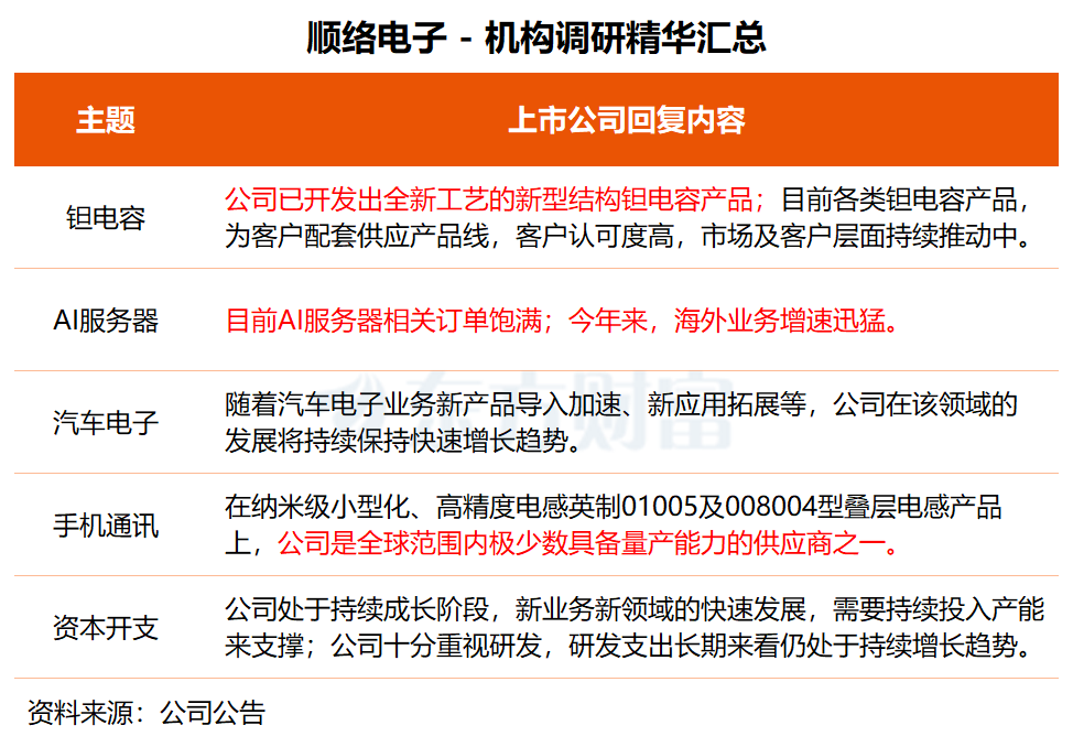顺络电子介绍,公司为各类AI服务器类客户提供一站式元器件解决方案,客户已覆盖国内头部服务器厂商及海外头部功率模块厂商。“目前公司AI服务器相关的订单饱满,相关业务快速增长(今年来,海外业务增速迅猛)。”