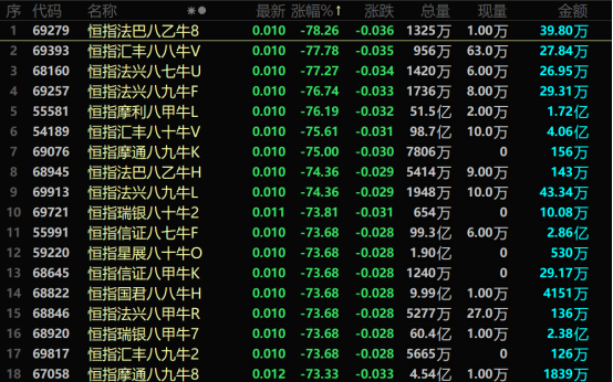在A股表现尚可的背景之下,港股市场连续两个交易日杀跌。12月9日午后,香港恒生指数跌幅扩大至1%,恒生科技指数跌幅扩大至2%。与此同时,恒指牛证出现大面积巨幅杀跌,大跌超77%,成交过百万港元的、等跌幅都超过了74%。