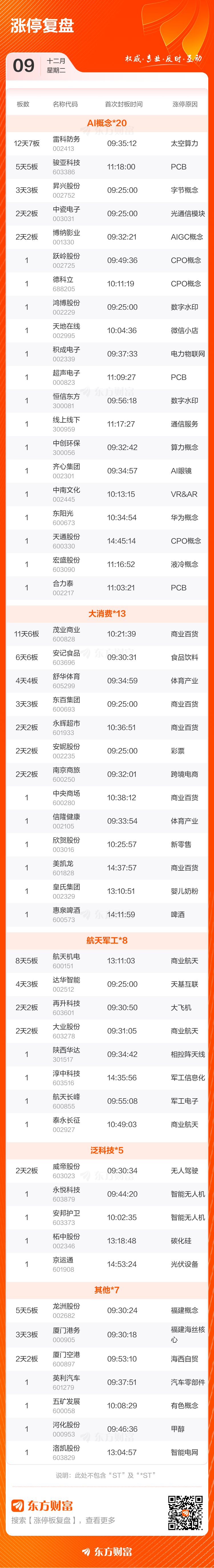 12月9日涨停复盘:54只股涨停 雷科防务12天7板 admin 2025-08-01 24287 默认 今天沪指跌0.37%,深成指跌0.39%,创业板指涨0.61%,今日大盘成交额1.90万亿,较上个交易日缩量1326.93亿。 涨停个股数量方面,今日共计54股涨停,另有29只个股盘中一度触及涨停,封板率65.06%。 免责声明:本文基于AI生产,仅供参考,不构成任何投资建议,据此操作风险自担。 海报 阅读 QQ 分享 微博分享 微信分享 分享 上一篇国内成品油价今晚下调 加满一箱油少花2元 下一篇央行:12月5日将开展10000亿元买断式逆回购操作 国内成品油价今晚下调 加满一箱油少花2元上一篇 央行:12月5日将开展10000亿元买断式逆回购操作下一篇