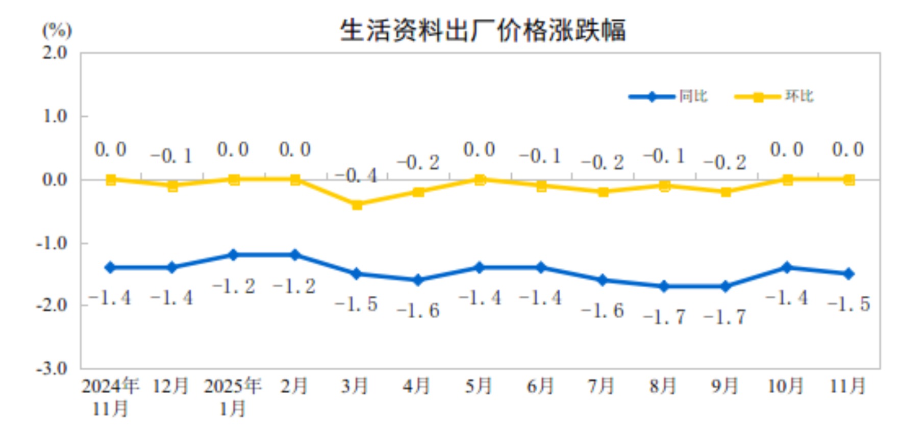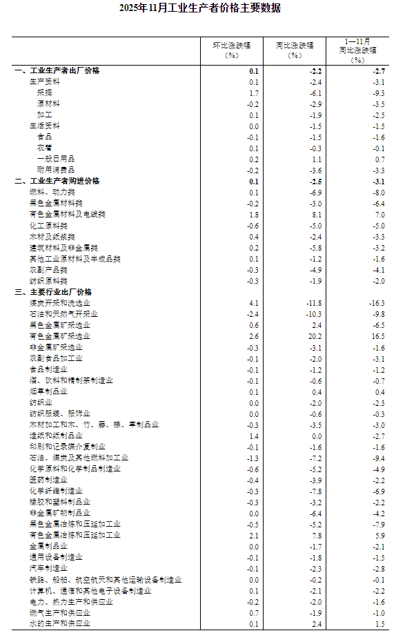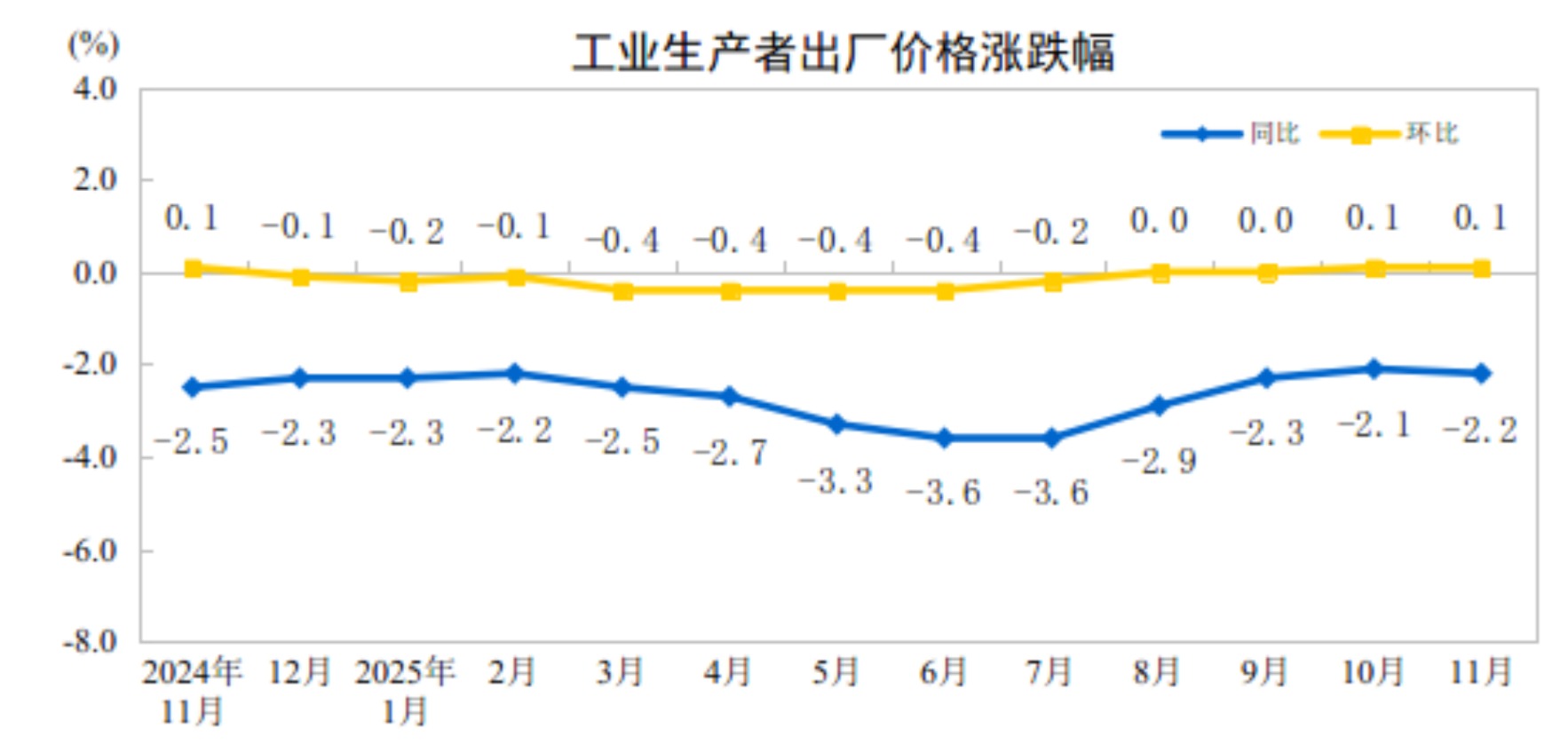 2025年11月份,全国工业生产者出厂价格同比下降2.2%,工业生产者购进价格同比下降2.5%;工业生产者出厂价格和购进价格环比均上涨0.1%,涨幅均与上月相同。1—11月平均,工业生产者出厂价格比上年同期下降2.7%,工业生产者购进价格下降3.1%。