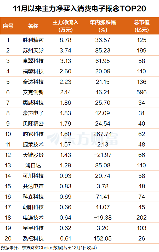 Choice数据显示,自11月以来,主力资金抢筹多只消费电子概念股,排名第一,主力净买入近9亿元;排名第二,主力净买入近4亿元。