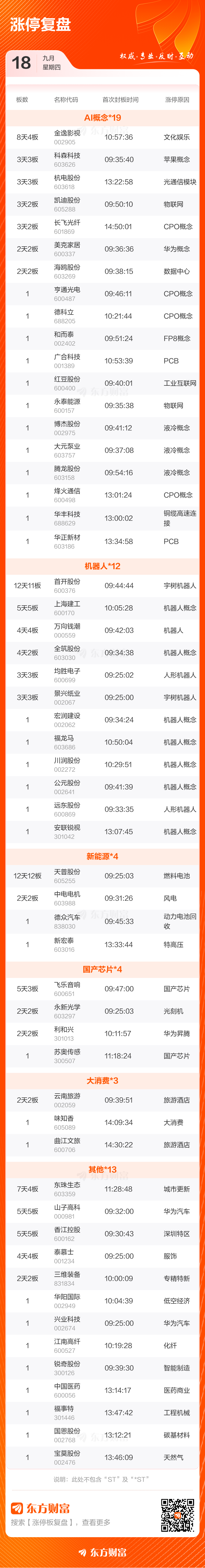 9月18日涨停复盘:64只股涨停 首开股份12天11板 admin 2025-08-12 22664 默认 今天沪指跌1.15%,深成指跌1.06%,创业板指跌1.64%,今日大盘成交额3.14万亿,较上个交易日放量7584.25亿。 涨停个股数量方面,今日共计64股涨停,另有70只个股盘中一度触及涨停,封板率47.76%。 个股方面 免责声明:本文基于AI生产,仅供参考,不构成任何投资建议,据此操作风险自担。 (文章来源:研究中心) 海报 阅读 QQ 分享 微博分享 微信分享 分享 上一篇少见!11月国内乘用车零售销量同比下降8.1% 乘联分会预测:2026年车市增长面临压力 下一篇全球最大锂矿商获瑞银力挺 美国雅保盘中一度飙涨9% 少见!11月国内乘用车零售销量同比下降8.1% 乘联分会预测:2026年车市增长面临压力上一篇 全球最大锂矿商获瑞银力挺 美国雅保盘中一度飙涨9%下一篇