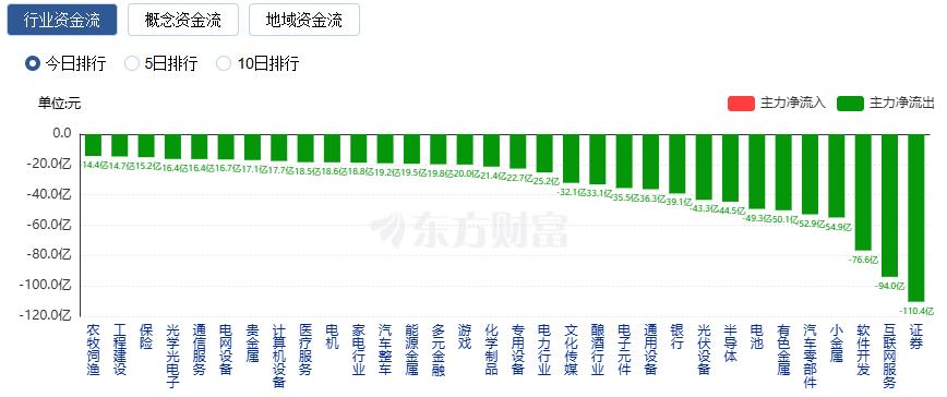净流出方面,证券、、等净流出排名靠前,其中证券净流出110.4亿元。