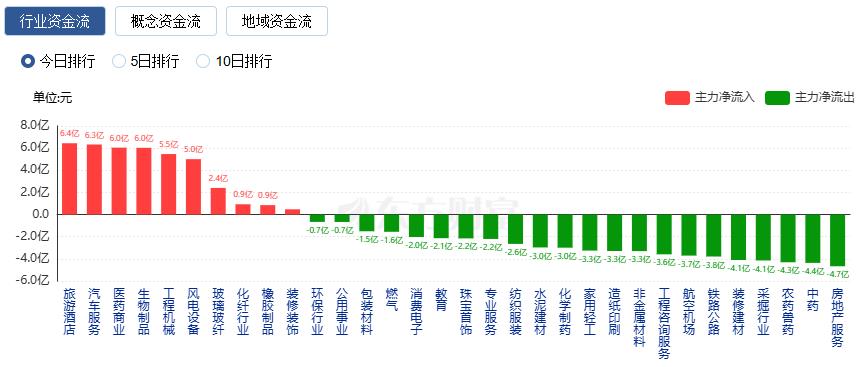 行业资金方面,截至收盘,旅游酒店、汽车服务、等净流入排名靠前,其中旅游酒店净流入6.44亿。