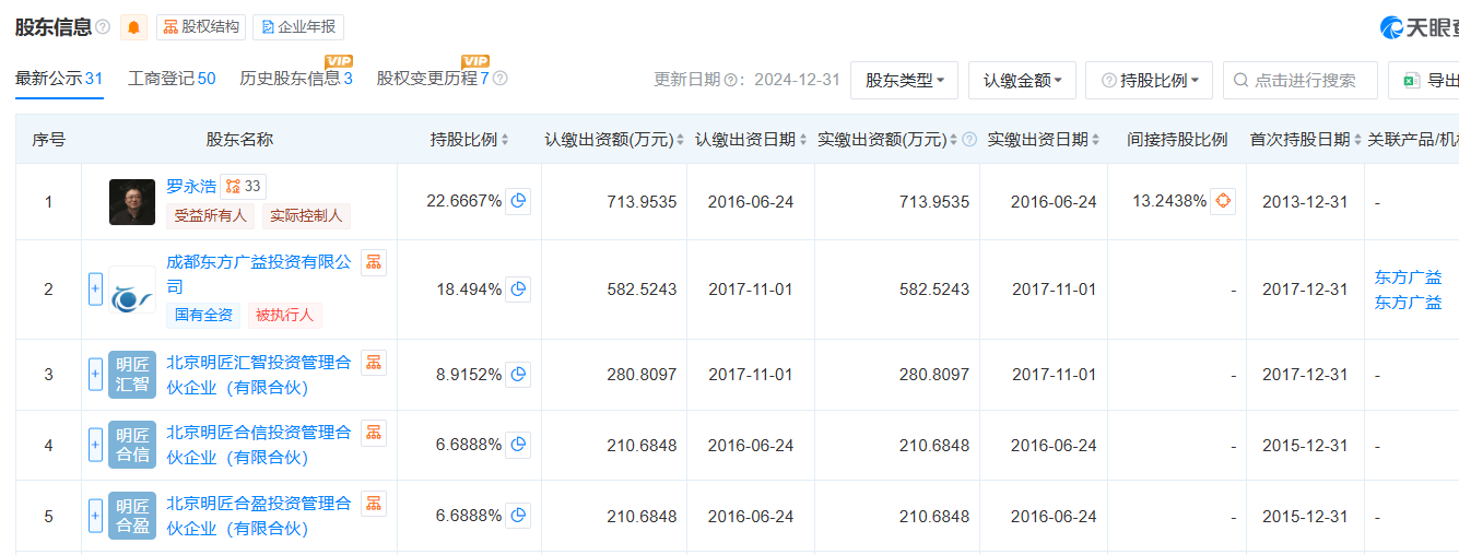 股东信息显示,该公司由罗永浩、成都东方广益投资有限公司、北京明匠汇智投资管理合伙企业(有限合伙)等共同持股。目前,罗永浩仍是锤子科技(成都)股份有限公司董事长、受益所有人、实际控制人,持有该公司22.6667%的股份。
