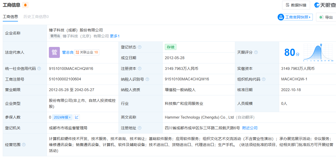 公开资料显示,锤子科技(成都)股份有限公司成立于2012年5月,法定代表人为管志良,注册资本约3149.8万人民币,经营范围涵盖基础软件服务、应用软件服务、组织文化艺术交流活动等。