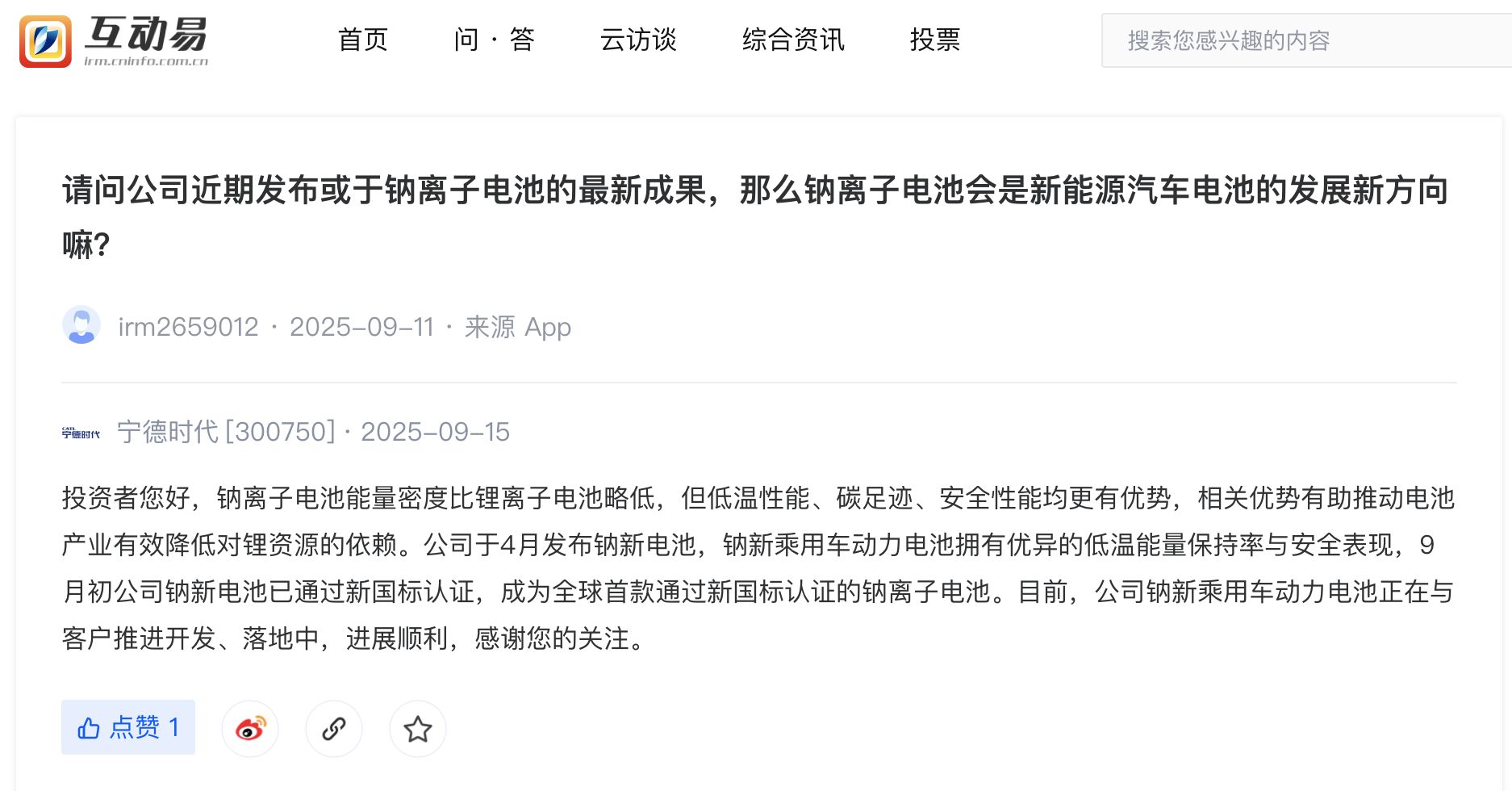 9月17日,(300750.SZ)在互动平台表示,能量密度比锂离子略低,但低温性能、碳足迹、安全性能均更有优势。