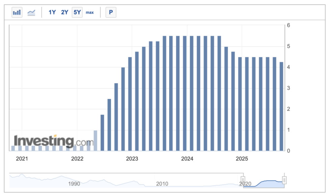 鉴于通胀进展和风险平衡,FOMC决定将联邦基金利率目标区间下调0.25个百分点(即25个基点)至4.00%—4.25%。在考虑进一步进行调整时,委员会将审慎评估最新数据、经济前景的演变以及风险平衡。